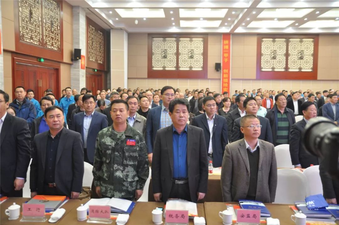 大會在雄壯的國歌聲中(zhōng)開始。