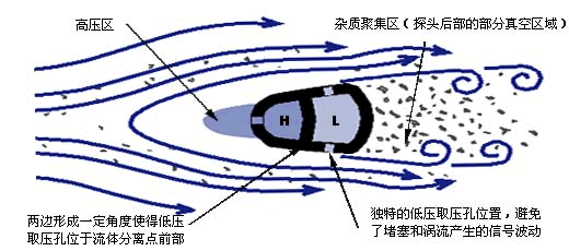 探頭的前部形(xíng)成高壓區,壓力略高於管道(dào)靜壓,阻止了顆(kē)粒(lì)進入。請注意:在(zài)探頭(tóu)的高壓取壓孔(kǒng)處流體的速度是零,沒有物體會進入(rù)取壓(yā)孔。