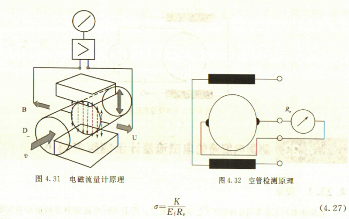 電磁流量計是專為測量導電液體的體積流量而設計的。測量原理是(shì)基於法拉第電磁感應(yīng)定律。按照該定律,導電流(liú)體通過磁場作切割磁力線運動時,在垂直於磁場及流速(sù)的方向上產生(shēng)感應電動(dòng)勢,此電動勢由4.14節中的式4.24)給出。其原理(lǐ)如圖4.31所示。