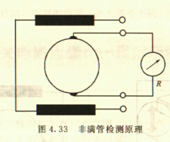 非滿管檢測也是基於電導率檢側的方法。在圖4.33所示的電磁流量傳感器中,增加了一(yī)個(或一對)非滿(mǎn)管檢測電極。當導管(guǎn)內液體滿管時,頂部電極與其他電極之間的電阻值很小;而當存在非滿管情況(kuàng)時,頂部電極與導電液體之間(jiān)有氣體阻隔,所以電極電阻顯(xiǎn)著增大,從而做出非滿管判斷。